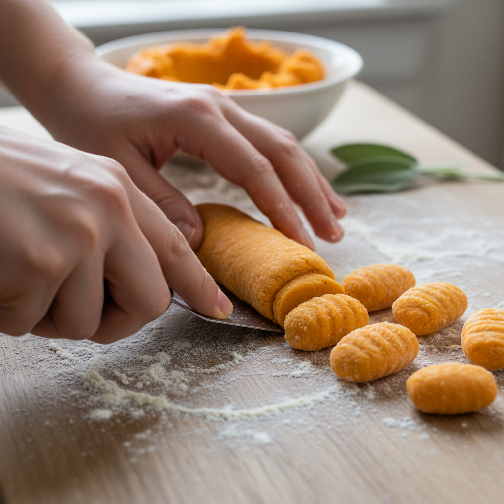 - Roll and Cut: Lightly flour your work surface. Take a portion of the dough and roll it into a long, snake-like rope about 1/2-inch thick. Use a knife or a bench scraper to cut the rope into small, 1/2-inch gnocchi pieces.