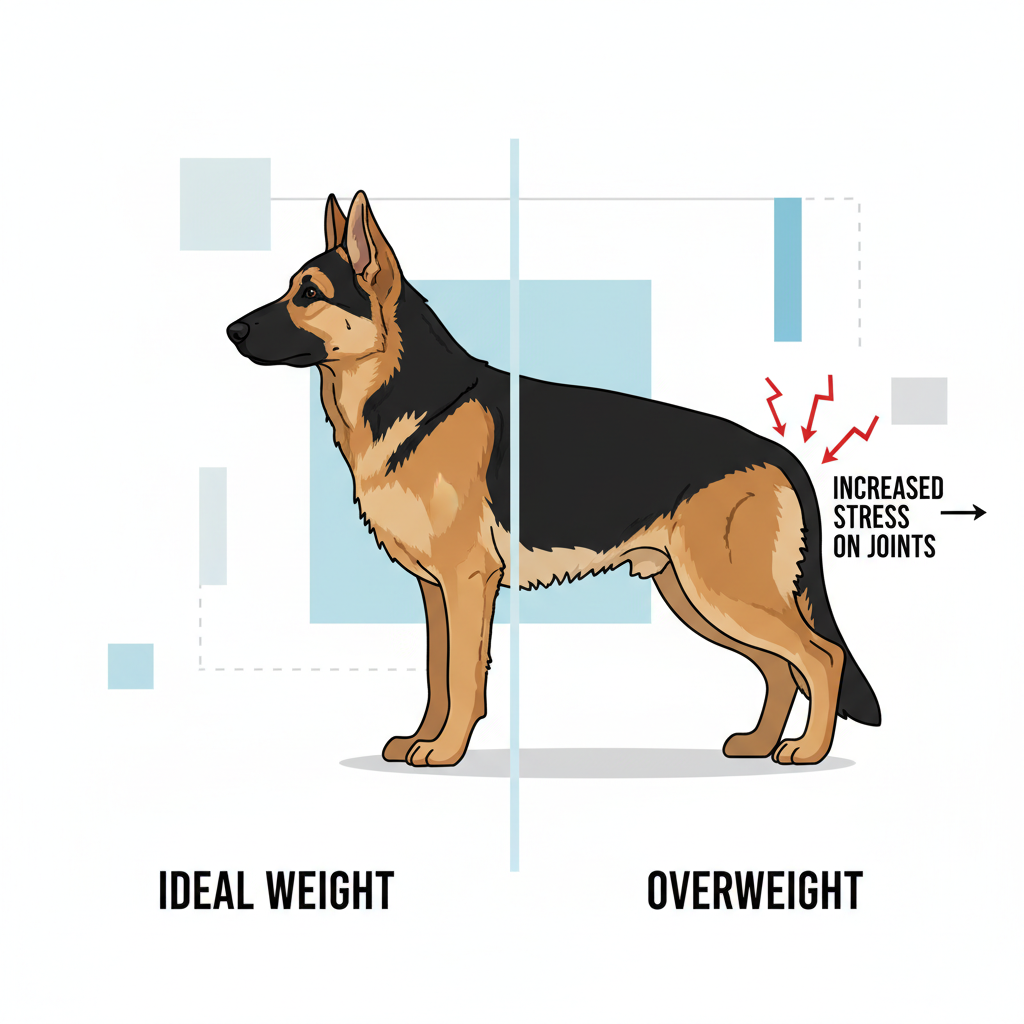 An overweight GSD carries excess fat, which not only adds physical strain but also produces inflammatory hormones, creating a vicious cycle of pain and joint degradation. Your goal is to be able to easily feel your dog’s ribs and see a distinct abdominal tuck when viewed from the side.