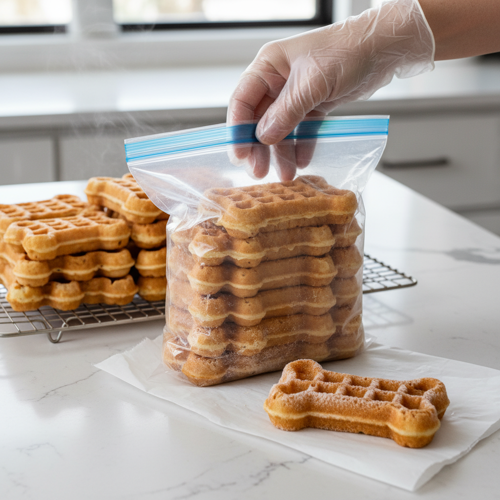 Once cooked, place all waffles on wire cooling racks. Do not stack them. Proper air circulation is essential to prevent them from becoming soggy. They must be cooled to room temperature before storage. This can take up to one hour. Skipping this step will result in ice crystal formation and freezer burn.