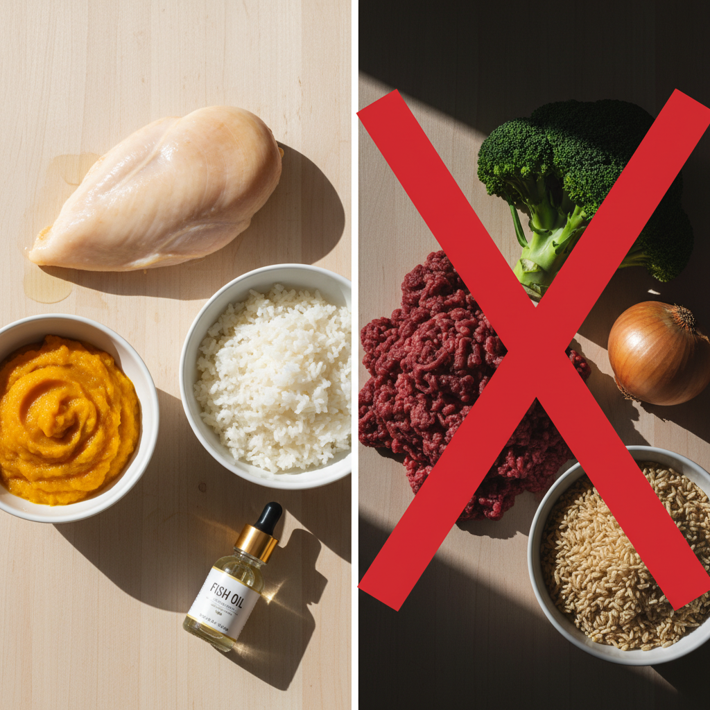 • Onions, Garlic, Seasonings: These are toxic to dogs and must never be included. The diet must be completely bland.