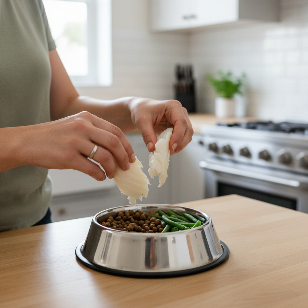 - Portion Control is Key: Fish should be treated as a high-value meal topper or a supplemental part of a balanced diet, not the entire meal (unless you are working with a veterinary nutritionist). A good rule of thumb is that treats and toppers should not exceed 10% of your dog’s total daily caloric intake. For a 50lb dog, a couple of tablespoons of flaked fish mixed into their regular food once or twice a week is a safe starting point.