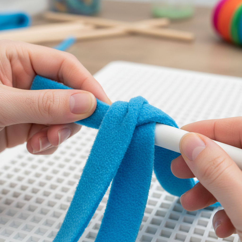 - The Larks Head Knot: We will not use a simple double knot. We will use a Larks Head knot (also known as a cow hitch). This creates a secure, dense pile. To tie it: Fold one fleece strip in half to create a loop at one end.