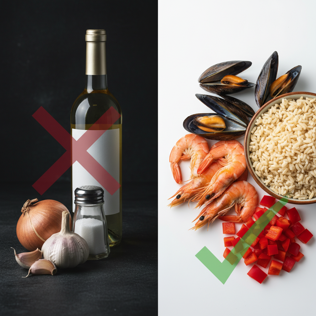 A successful hack requires knowing the enemy. In this case, the ‘enemies’ are the common paella ingredients that are harmful to dogs. We will surgically remove them and substitute them with ‘hero’ ingredients that provide nutritional benefits. Below is your forensic guide to building a safe paella base.