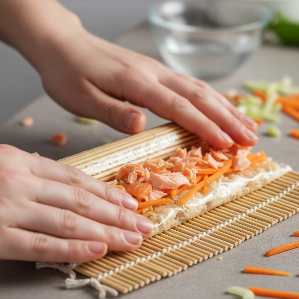 - Layer the Fillings: Arrange the flaked salmon and julienned vegetables in a horizontal line about an inch from the bottom edge of the nori. Don’t overfill, or the roll will be difficult to close.