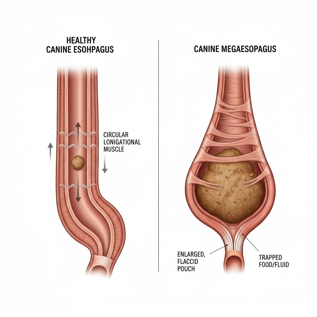 To defeat an enemy, you must first understand it. With megaesophagus, your primary adversary isn’t the condition itself, but its most dangerous complication: aspiration pneumonia. Every single meal carries a risk. Our goal is to mitigate that risk to near zero through meticulous preparation and procedure. The anatomy tells the story: a healthy esophagus uses coordinated muscular contractions (peristalsis) to push food down. In a dog with megaesophagus, that function is gone. The esophagus is essentially a passive, oversized pouch.