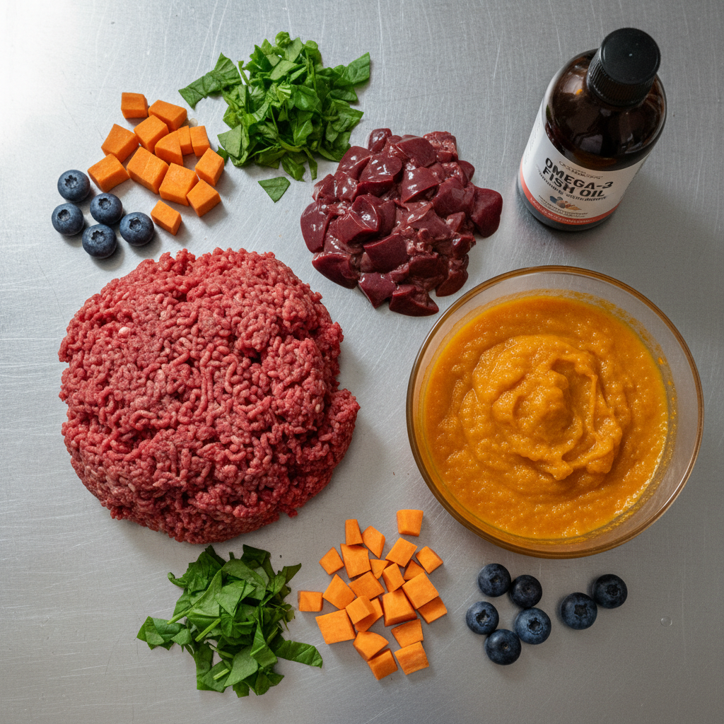 The Ratios: Aim for approximately 70% muscle meat, 10% organ meat, and 20% low-glycemic vegetables and healthy fats.
