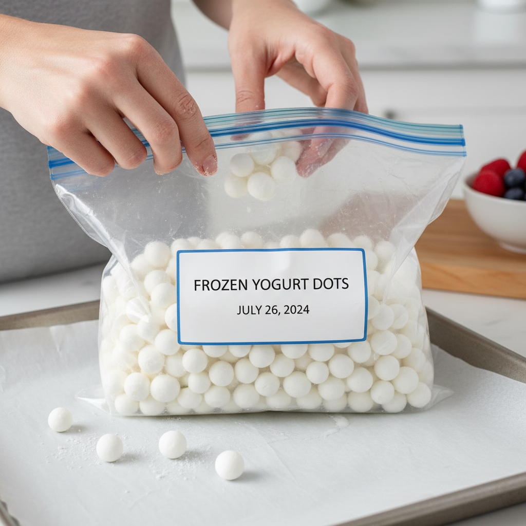 The ‘flash freeze’ on the parchment-lined tray is the most critical step. This freezes each dot individually, preventing them from clumping together into one giant, unusable yogurt-berg when you store them. Once they are frozen solid, you can simply lift the parchment paper and funnel them directly into your storage container of choice. A large, labeled freezer bag works perfectly. Squeeze out as much air as possible before sealing to prevent freezer burn.