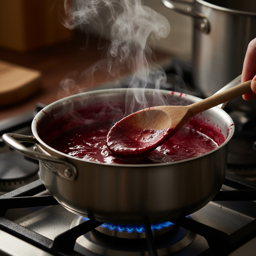 4. Gently simmer the juice over low heat. Do not boil. Let it reduce by about half. You will see the color darken and the liquid thicken slightly.