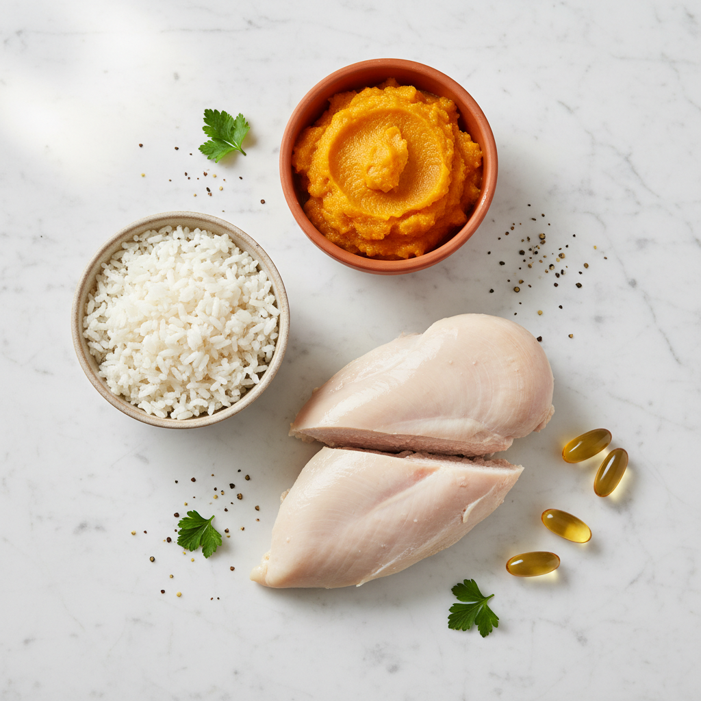 - The Digestible Carbohydrate (Approx. 25-40% of the meal): Plain, cooked white rice is the most common recommendation due to its blandness and digestibility. Cooked sweet potato is another excellent option.