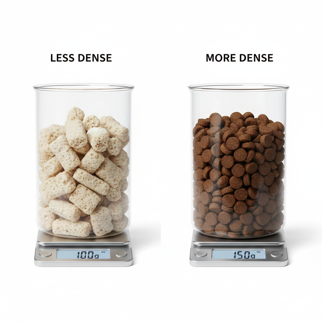 Because it doesn’t need to be ‘puffed’ with air, oven-baked kibble is naturally denser. A cup of oven-baked food can weigh significantly more than a cup of extruded kibble. This has two major benefits: