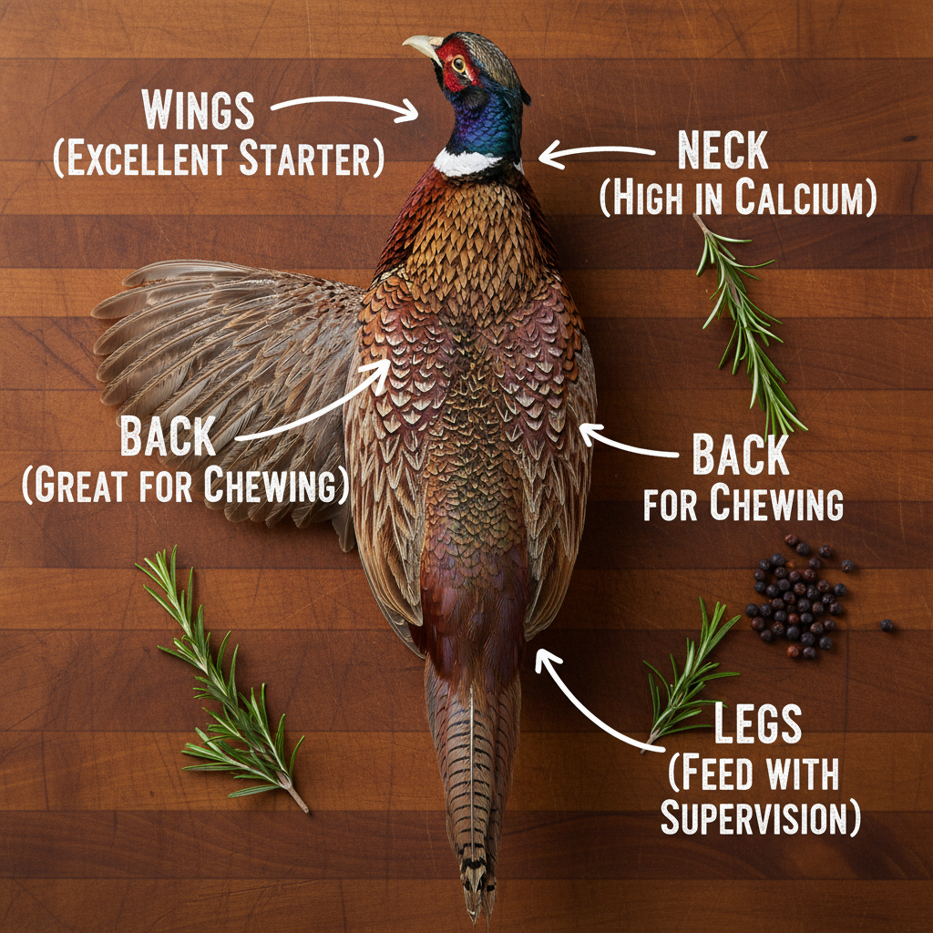 - Wings: Pheasant wings are an excellent starting point. They have a perfect ratio of meat, cartilage, and soft bone, making them easy for most dogs to handle and digest completely.