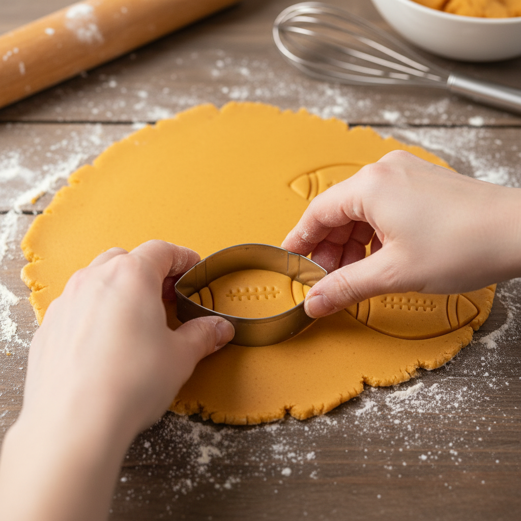 - Roll and Cut: Lightly flour a clean surface with oat flour. Turn the dough out and roll it to about 1/4-inch thickness. Use a football-shaped cookie cutter to cut out the treats. Place them on the prepared baking sheet. You can re-roll the scraps to use all the dough.