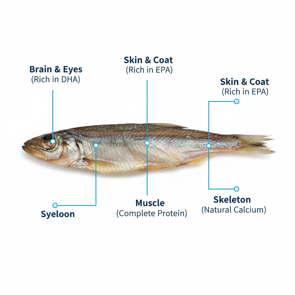 Because capelin are consumed whole—bones, organs, and all—they provide a unique spectrum of nutrients. The protein is highly digestible and contains a complete amino acid profile necessary for muscle maintenance and repair. Furthermore, the tiny, edible bones are a fantastic source of calcium and phosphorus, perfectly balanced by nature for skeletal health. This is a far superior source than the ‘calcium carbonate’ (essentially chalk) you see added to many commercial foods.